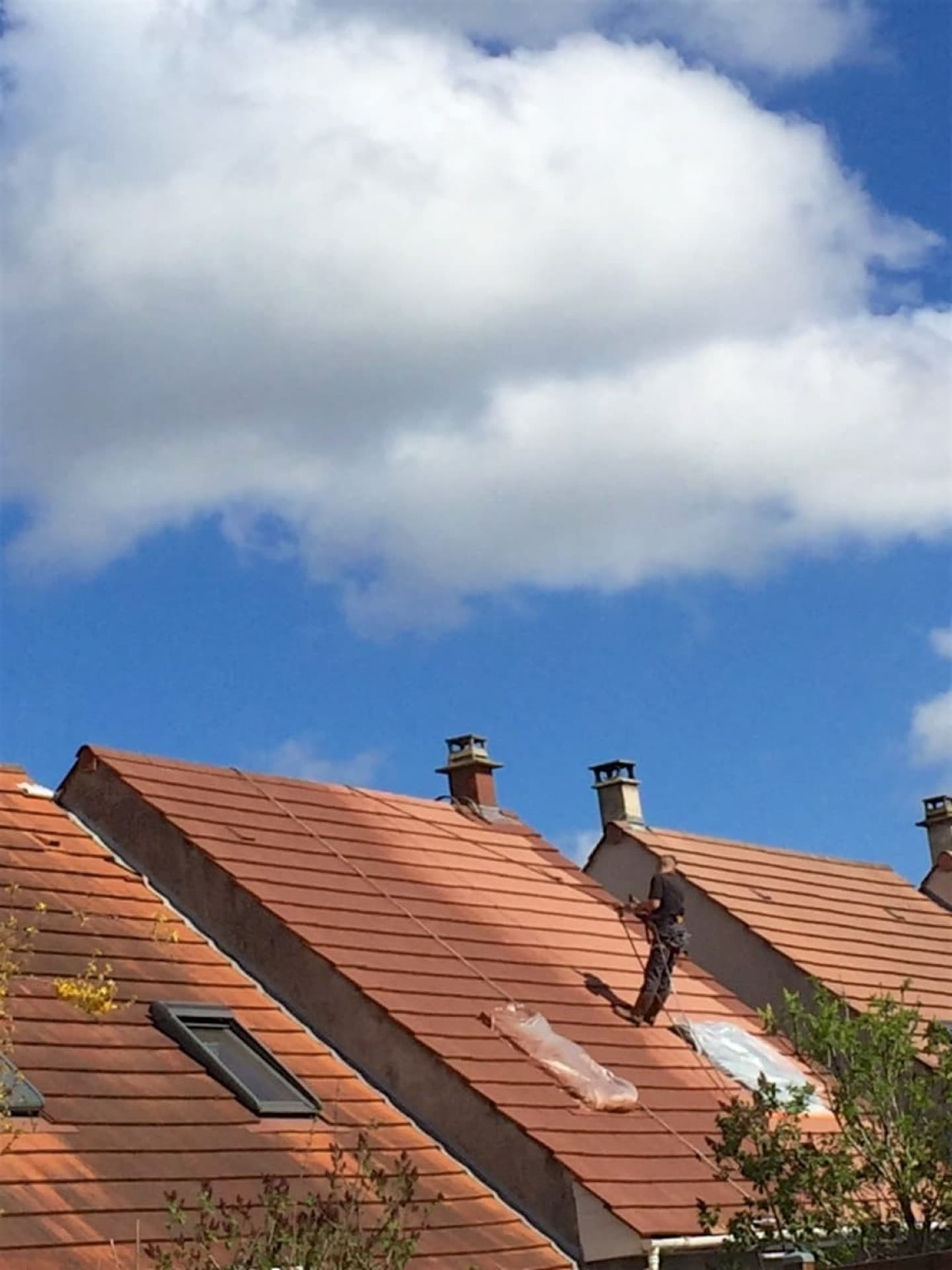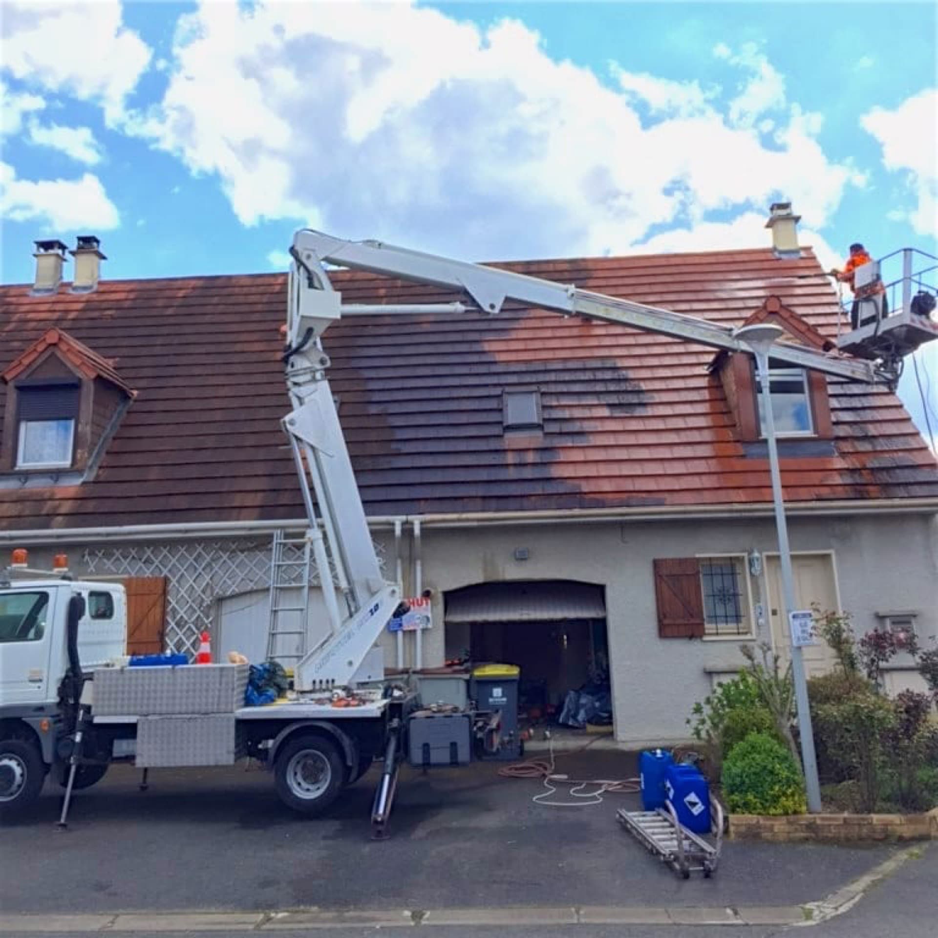 Notre client est le propriétaire d'une maison en Seine-et-Marne. Sa toiture était envahie par les mousses et les lichens, et présentait une coloration marquée en raison des effets du temps et de la météo. Pour la rénovation de cette toiture, nous avons effectué un nettoyage minutieux, ainsi qu'une mise en peinture soignée en veillant à protéger les ouvertures.