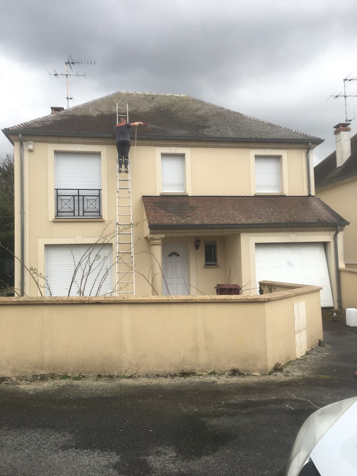 Nous sommes intervenus sur cette maison à Champs-sur-Marne pour un nettoyage avec pulvérisation anti-mousse DALEP 2100 sur la toiture et la façade.