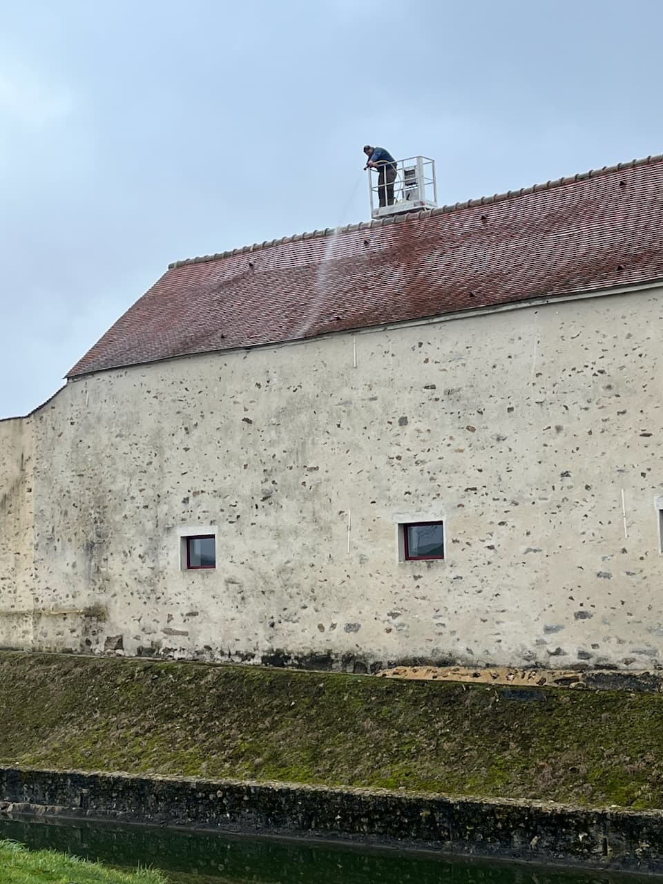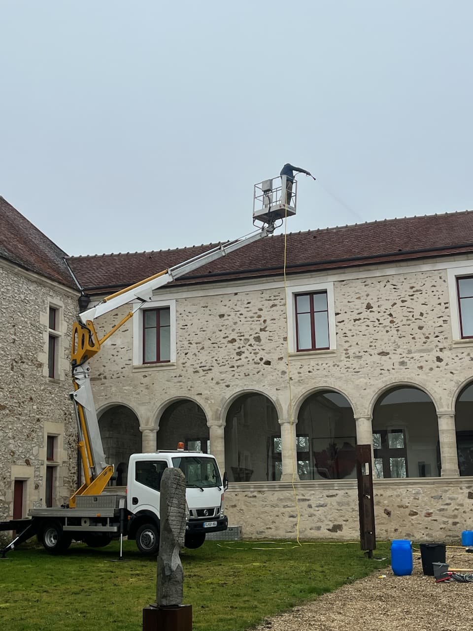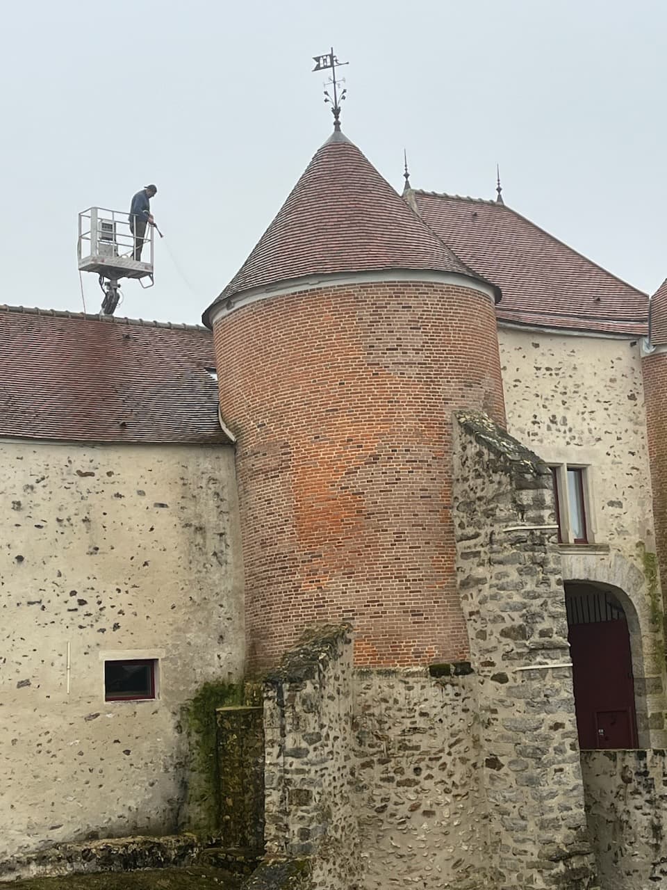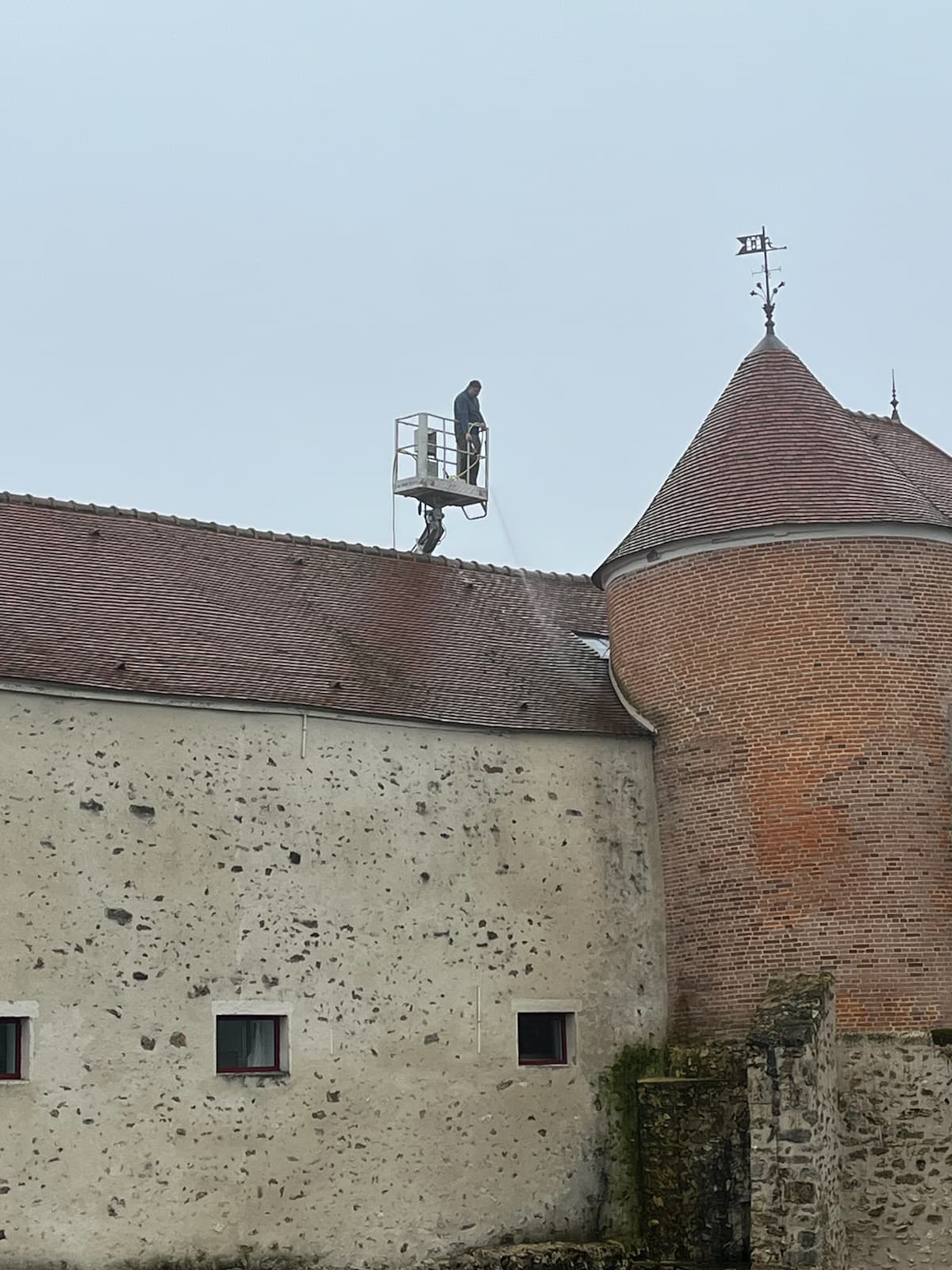 Intervention réalisée au Château de Launoy-Renault à Verdelot, pour procéder au nettoyage de la toiture et de la façade du bâtiment.