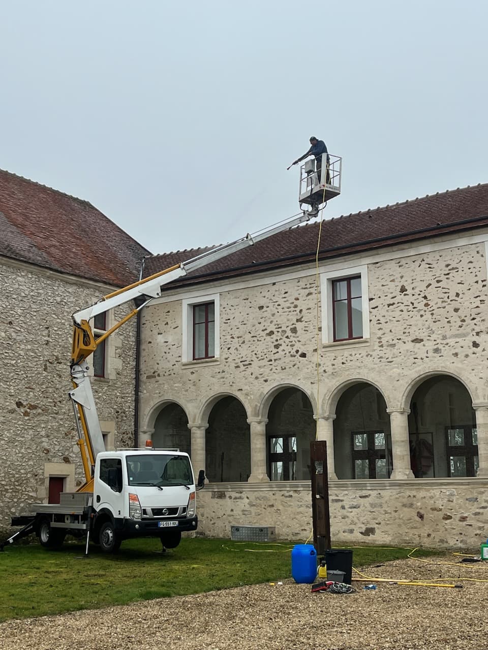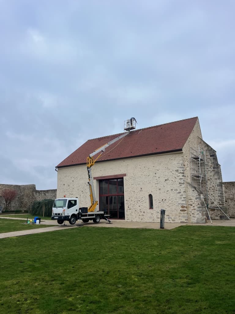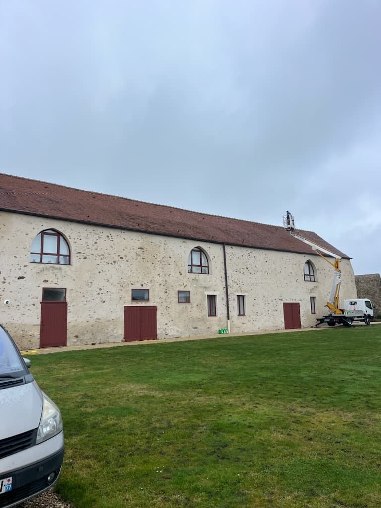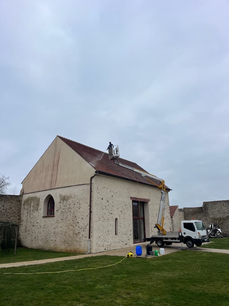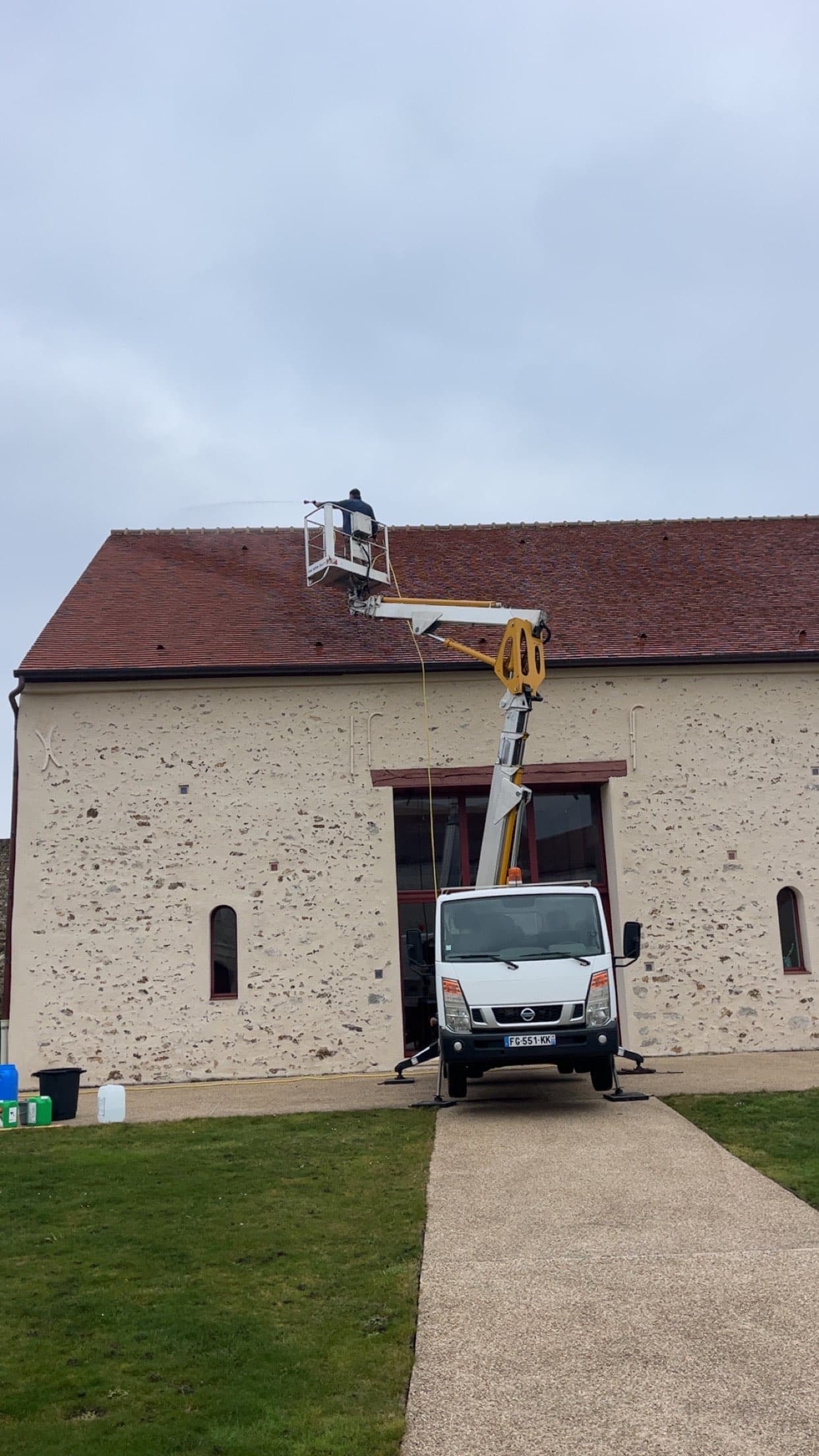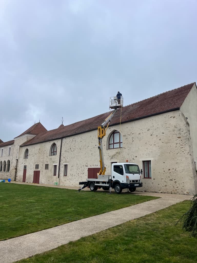 Intervention réalisée au Château de Launoy-Renault à Verdelot, pour procéder au nettoyage de la toiture et de la façade du bâtiment.